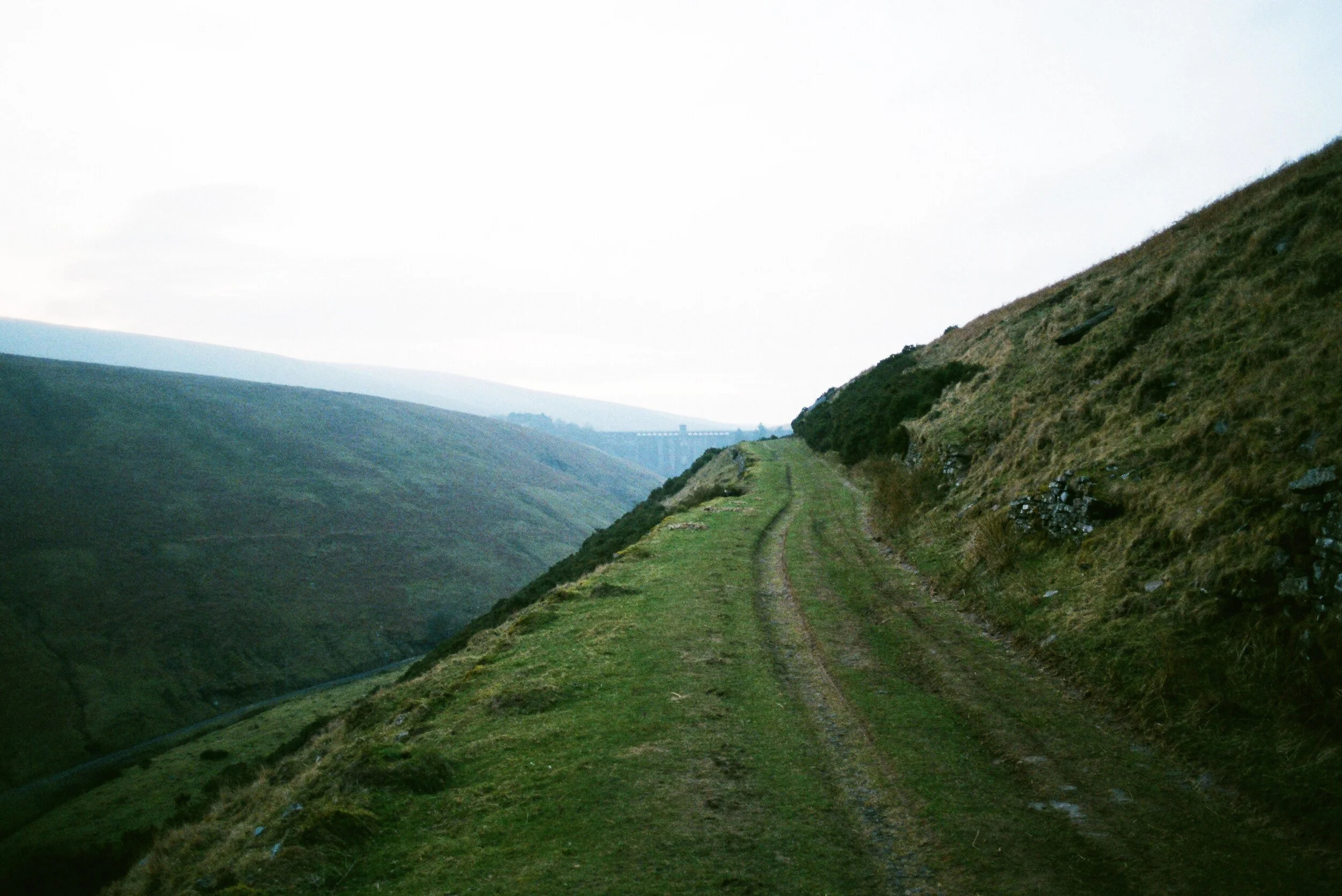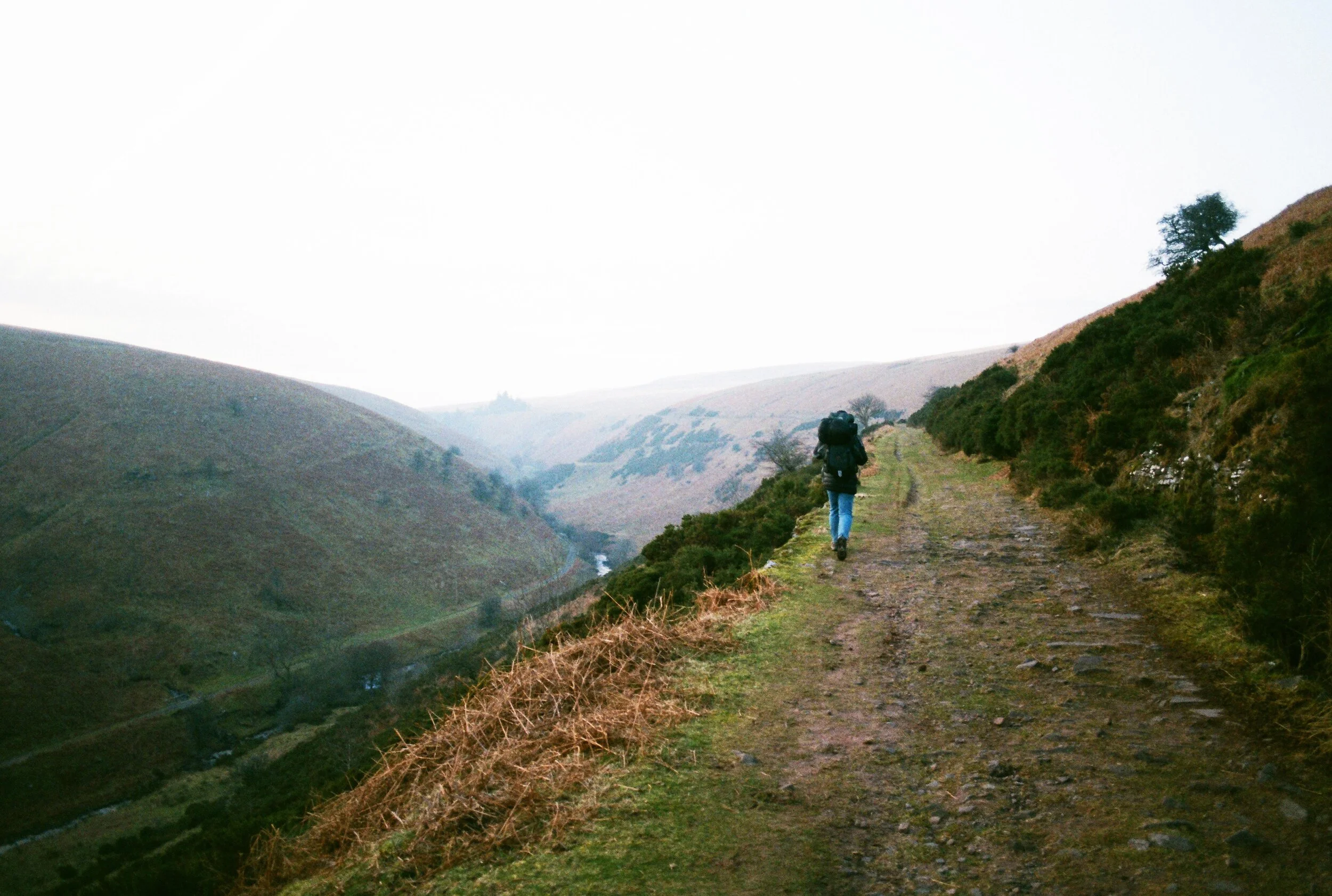 Bearing right up a trackway at the northern end of the car park, our phones lost signal from here on in. The trees swallowed us until we surfaced to high-level views across the valley. Patches of thin tree skeletons ran alongside a sweep of verdant pines, beyond which the misty outlines of the Black Mountains rumpled the horizon. The sun had fallen behind them, leaving a chalky blue haze in its wake. The route was a straight path all the way to an impressive Victorian dam at the southern end of the reservoir. The remains of a forgotten village still surround the site, built for construction workers and abandoned after the completion of the reservoir in 1928. The history of the bothy is also linked to this vast water basin, which is now decommissioned and no longer a drinking supply.